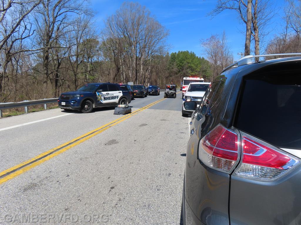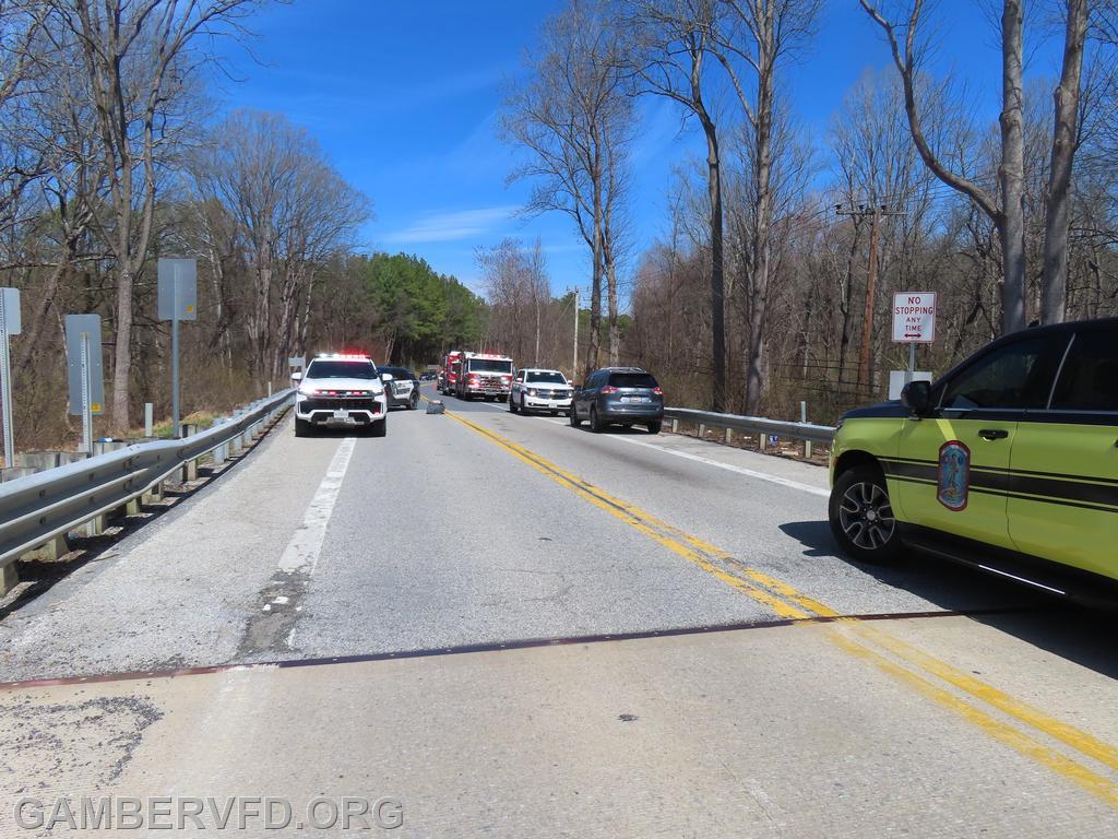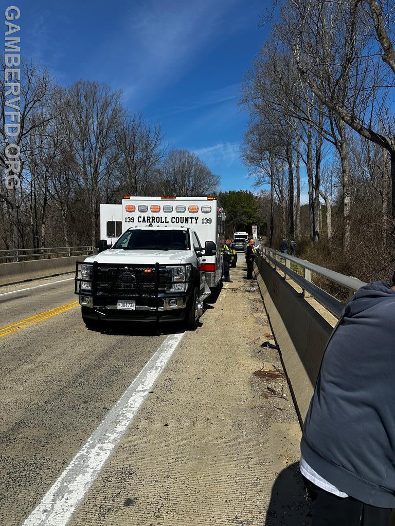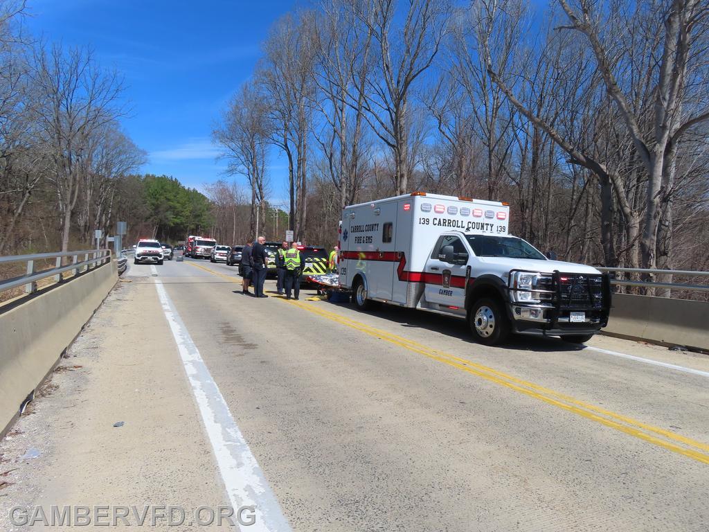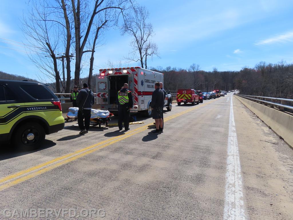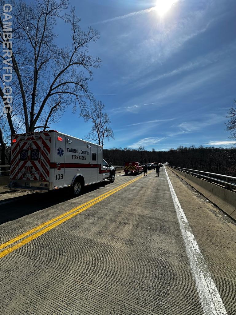 Units from Gamber, Reese, and Sykesville were dispatched along with CCDFEMS personnel. Law enforcement closed the bridge to all traffic and rescue personnel staged on the roadway. Responding personnel reported seeing the victim floating on the surface below. Rescue swimmers prepared to enter the water while Gamber's Boat 13 went to the boat docks off of Oakland Mills Road. Sykesville's ATV12 accessed the shoreline from the northeast side of the bridge. MSP Trooper 3 was alerted to transport the victim to the hospital with a landing site at Liberty High School. Winfield's engine was dispatched to handle the helicopter landing site.