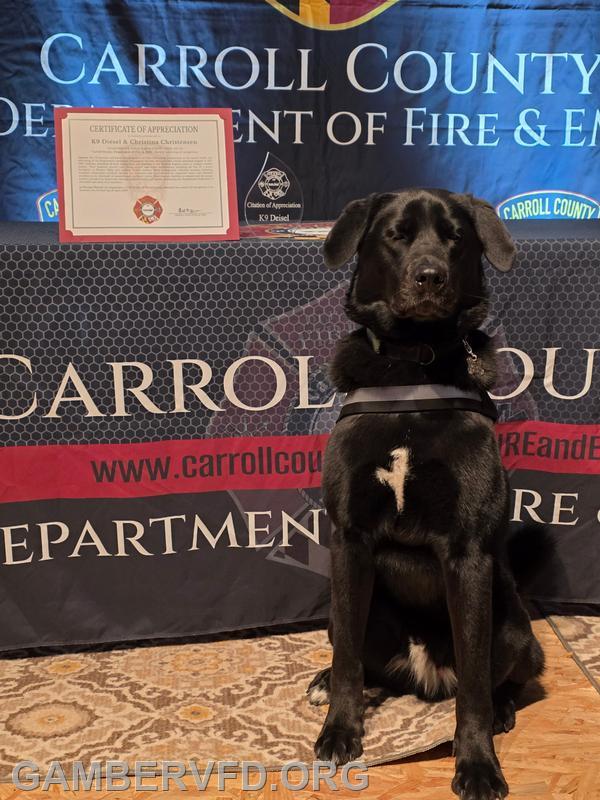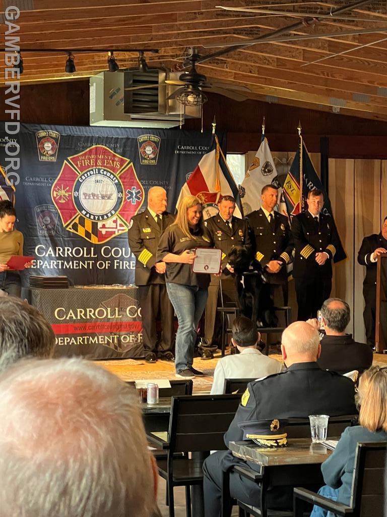 Also honored was Christina Christiansen and her therapy dog, Diesel. They were recognized as a team for their work supporting members of DFEMS over the past year. Although Christina is not a Gamber member, she assists at the station on frequent occasions along with her husband and daughter who are both members of Gamber.