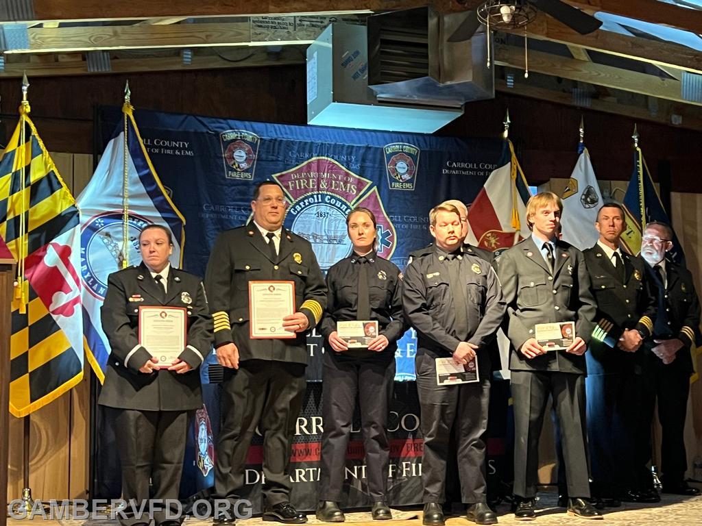 Personnel from Gamber Medic 139 and EMS 103 were "recognized for their exceptional clinical vigilance and rapid response during an incident that transitioned into a cardiac arrest on October 25, 2025. Their mastery of cardiac protocols and ability to manage a rapidly deteriorating patient under pressure directly resulted in a life saved, reflecting the highest traditions of the Carroll County Department of Fire & EMS." Those recognized were DFEMS Supervisor EMS 103, Lt. Briana Stull, Gamber Fire Chief Chad Hastings, DFEMS FF/PM Jess Jacobs and FF/EMT Tyler Drawbaugh, and Gamber volunteer FF/EMT Jacob Sherfey.