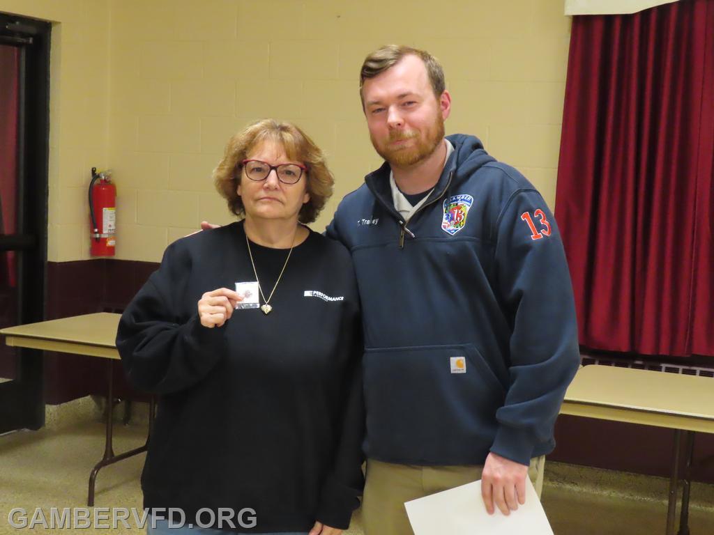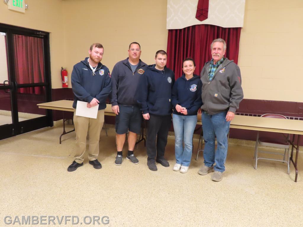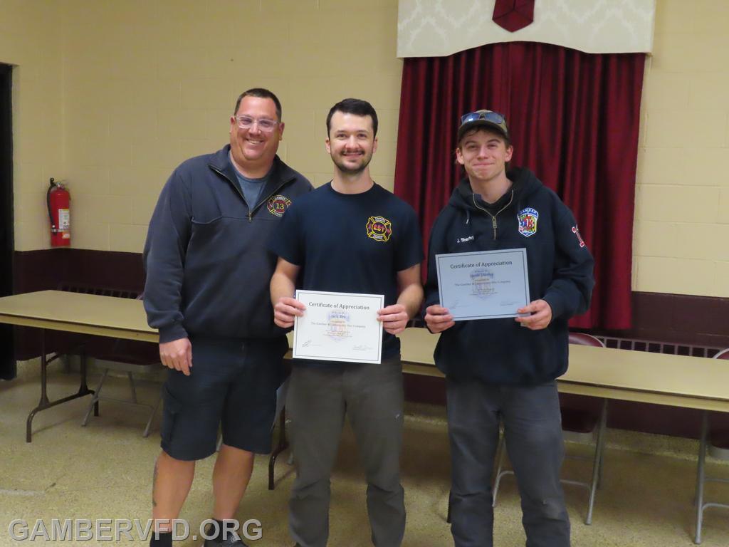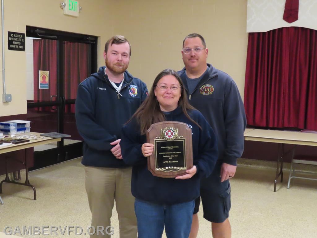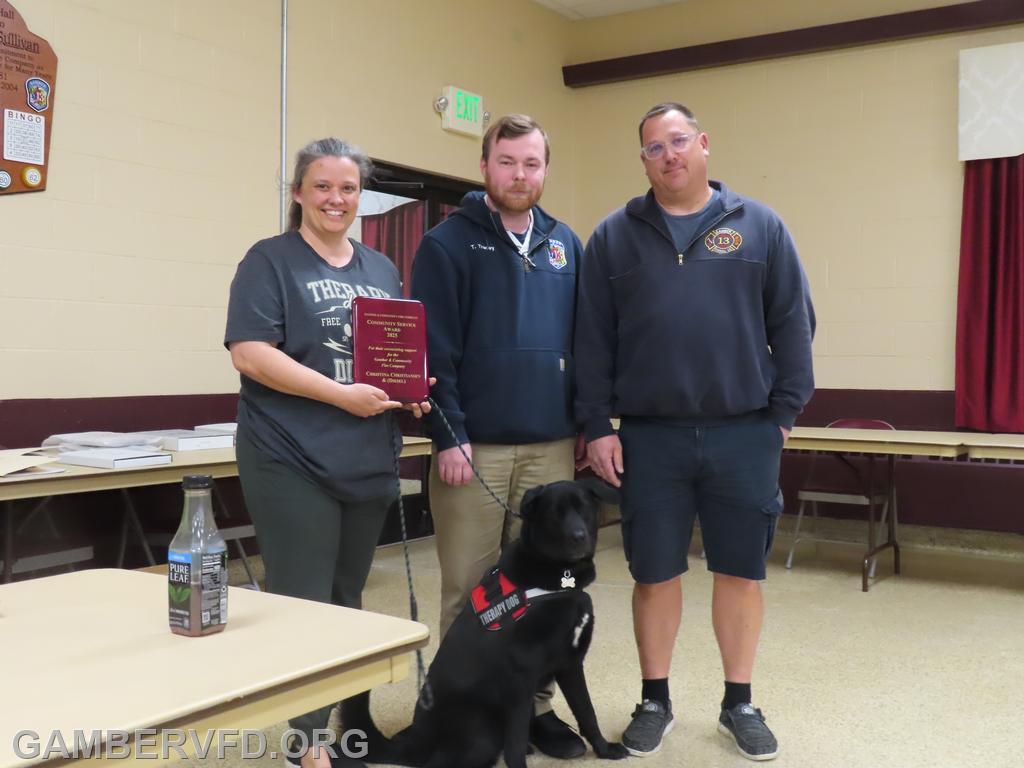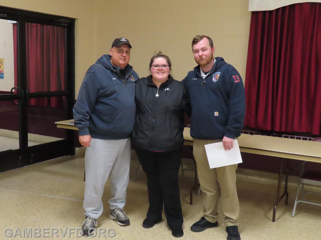 The Gerald L. Lindsay Memorial Firefighter of the Year Award was presented to Wyatt Frederick. Annie Reardon was presented with the Herman Hoff Memorial Award for Outstanding Service in Fundraising. Jeremy Sherfey was honored as the Administrative Member of the Year. The Garrett Lindsay Junior Firefighter of the Year Award was presented to Abbie Sherfey. This year's Community Service Award was presented to Christina Christiansen and her therapy dog, Diesel. The Rookie of the Year Award was presented to Blake Gable.